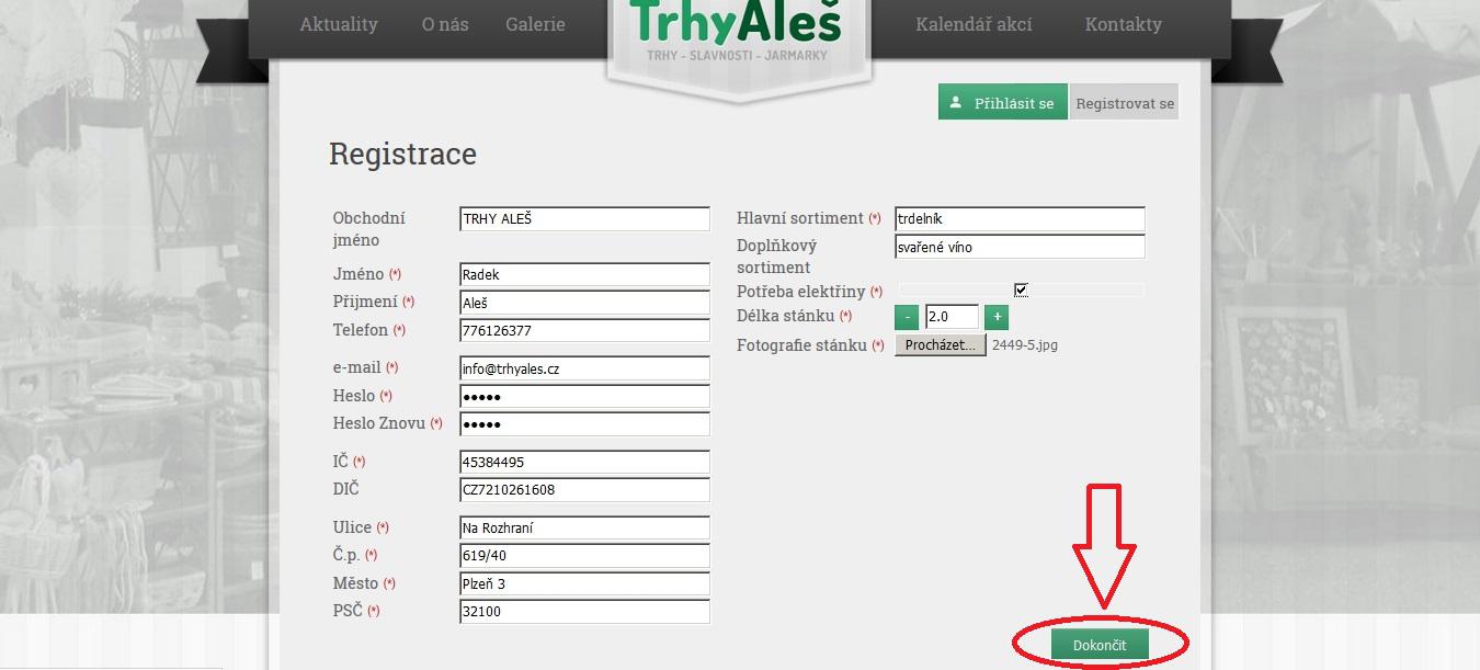 Zobrazí se Vám registrační formulář. Pole označená červenou hvězdičkou jsou povinná. Do pole "Obchodní jméno" zadávejte jméno FO nebo PO zapsané v živnostenském, obchodním či jiném rejstříku. Vyplňte formulář a klikněte na tlačítko "Dokončit“. Rezervace musí projít schvalovacím procesem. Po schválení Vám bude účet aktivován.