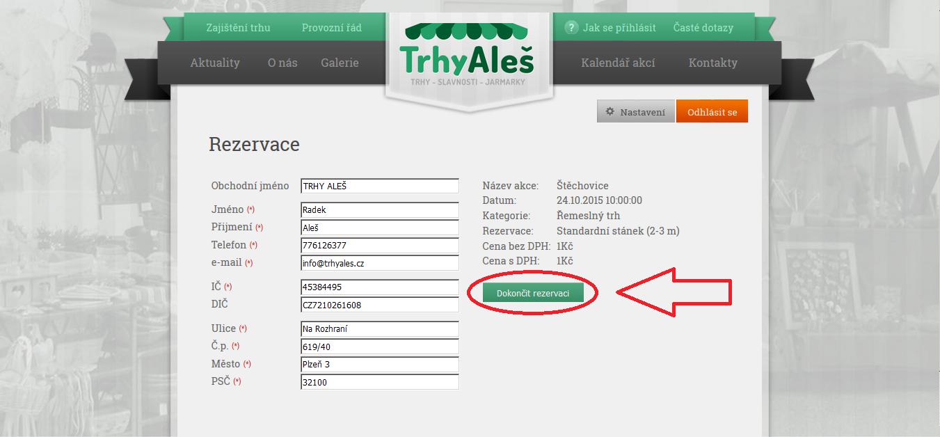 Zkontrolujte vyplněné údaje a klikněte na "Dokončit rezervaci". Nyní jen stačí vyčkat na e-mail s potvrzením rezervace a s pokyny k platbě. Propozice k akci Vám budou doručeny nejdéle 24 h před začátkem akce.