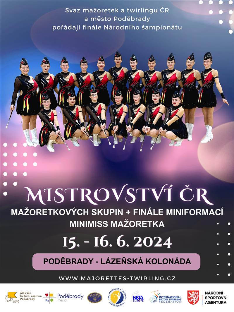 Ve spolupráci s Městským kulturním centrem Poděbrady a Svazem mažoretek a twirlingu ČR vás srdečně zveme na MČR mažoretkových skupin a finále miniformací minimiss mažoretka, které se uskuteční ve dnech 15. a 16. 6. 2024 na kolonádě v Poděbradech. Očekávaná návštěvnost činí cca 2000 lidí denně.